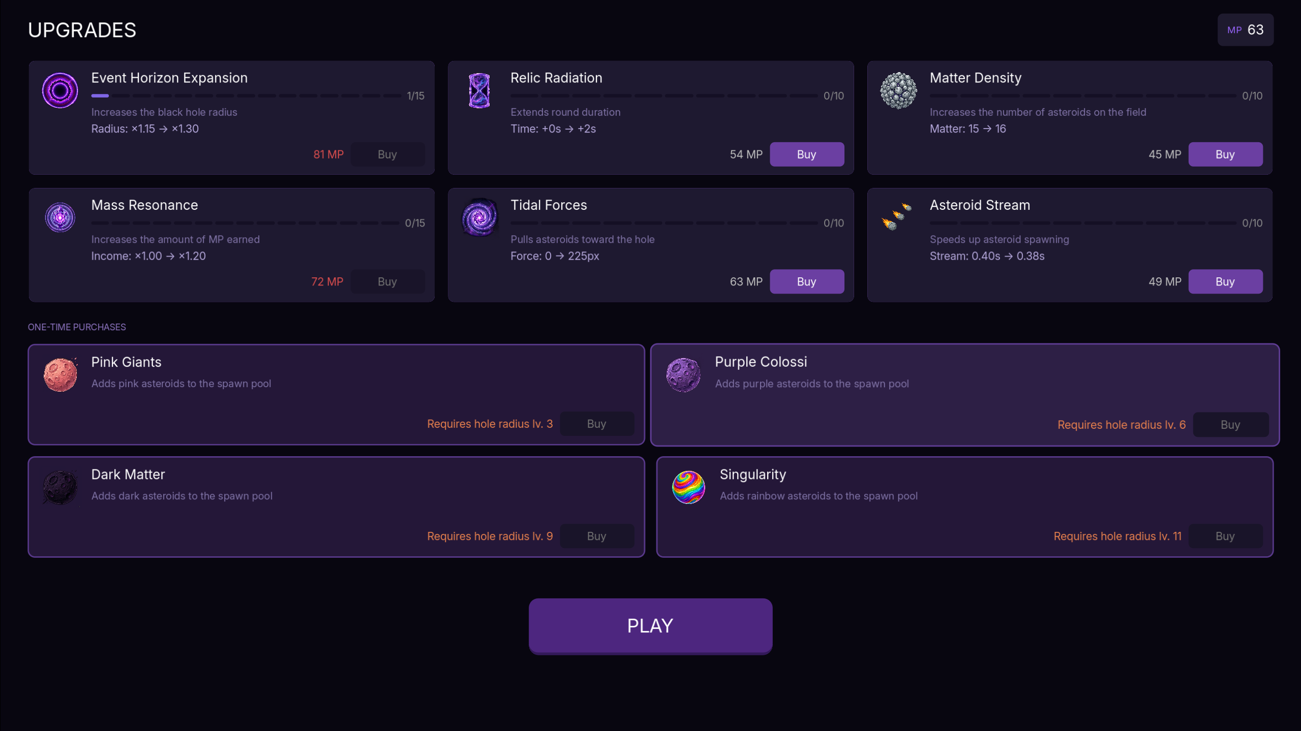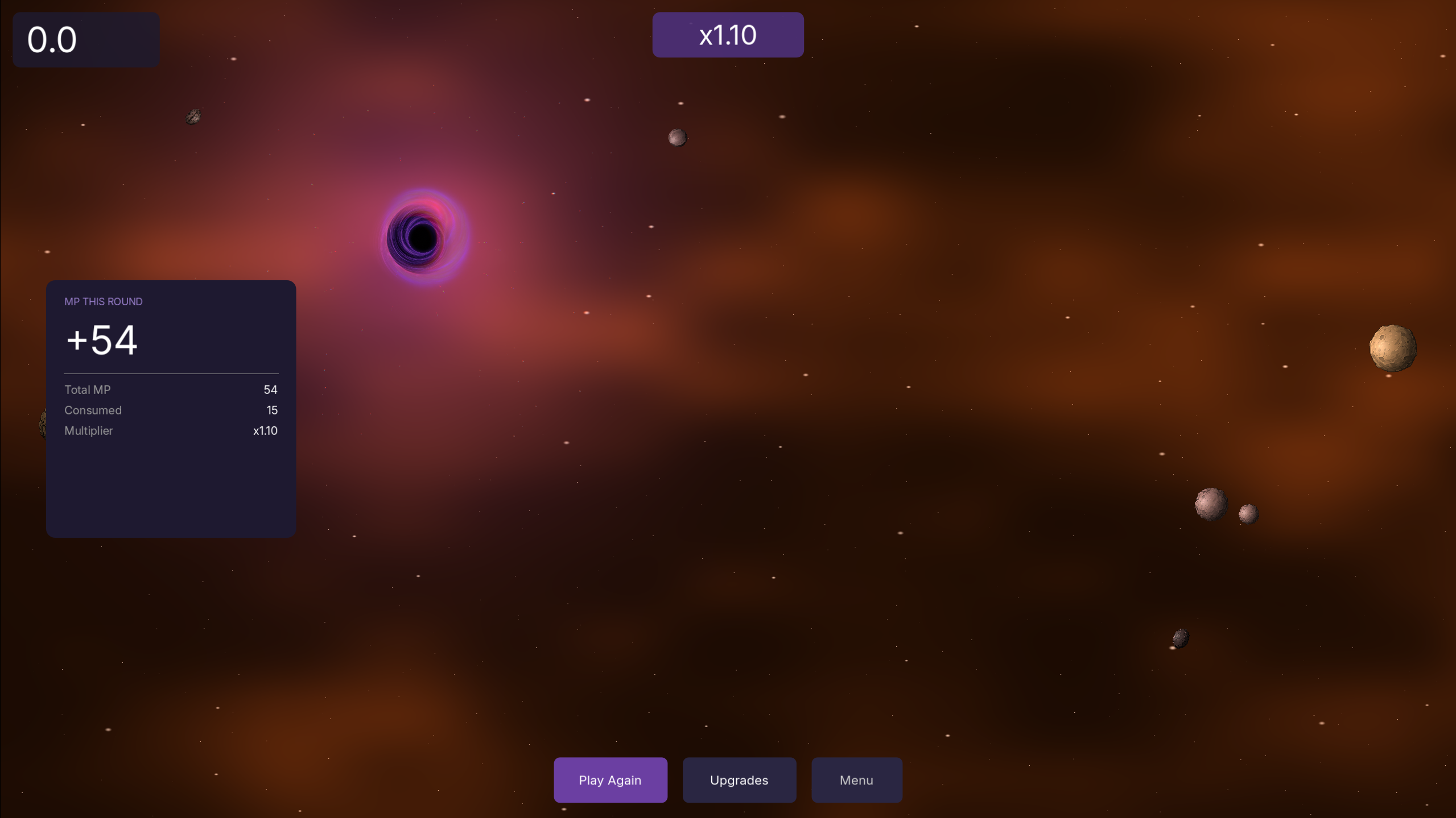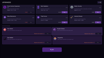 Move across the field, absorb asteroids, grow larger. Spend the collected matter between rounds to expand your event horizon, increase gravitational pull, and unlock new asteroid types.